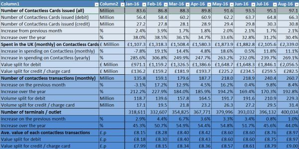 Tháng 11/2016 đánh dấu sự tăng trưởng mạnh mẽ của thanh toán không tiếp xúc, tổng giá trị giao dịch bằng công nghệ này đã đạt mức kỷ lục 2,9 tỷ £ trong tháng 11. Tổng giá trị giao dịch đã tăng 184% so với năm ngoái khi chi tiêu thanh toán không tiếp xúc lần đầu tiên đạt mức 1 tỷ £ trong tháng.