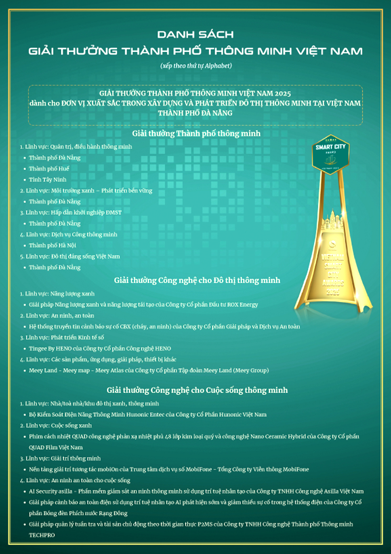 - Giải thưởng Thành phố Thông minh Việt Nam 2025 (Vietnam Smart City Award 2025) hôm nay đã được trao cho 8 khối Đô thị và 10 Giải pháp công nghệ tiêu biểu, hướng đến mục tiêu kiến tạo những "Thành phố đáng sống". Hiệp hội Phần mềm và Dịch vụ CNTT Việt Nam (VINASA) hôm nay tổ chức Lễ Công bố và Trao Giải thưởng Thành phố Thông minh Việt Nam 2025 (Vietnam Smart City Award 2025). Sự kiện năm nay không chỉ đánh dấu bước chuyển mình của các đô thị sang kỷ nguyên "Chuyển đổi Kép" (Xanh & Số) mà còn tôn vinh mục tiêu cốt lõi nhất của công nghệ: Kiến tạo những "Thành phố đáng sống".